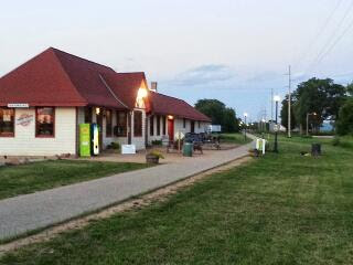 50 or so miles later, i make it to shawano. the trail is interrupted for a bit, but i finally pick it back up. there's a bike store in an old railway depot at the head of the restart, and contrary to my normal behavior, i stop. it's around 7pm, 110 miles for the day, and i'm looking for a place to pitch my tent. it turns out there are three late 40's guys sitting there drinking bud light. they invite me, offer me a beer, they offer to let me sleep there on the side of the trail, and call the local constable to make sure it's okay. even though it's technically city property, the police say that they'll treat it like the bike shop owns it and it's alright if i sleep there. so i do.